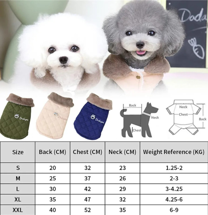 【5 گزینه سایز مختلف】 این کاپشن گرم و نرم سگ برای سگهای کوچک تا متوسط در سایزهای S، M، L، XL، XXL طراحی شده است. توجه: لطفاً پهنترین قسمت سینه و قسمت پایین گردن سگ خود را اندازهگیری کرده و به نمودار سایز مراجعه کنید. میزان پوشش در پشت بسته به اندازه سگ شما متفاوت خواهد بود.