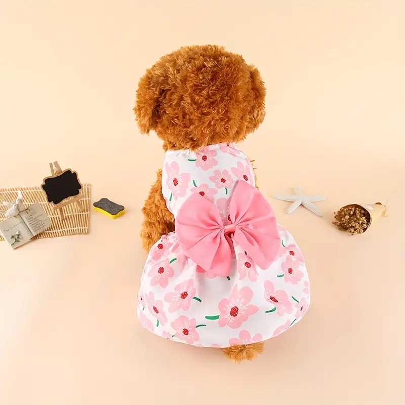 Cherry Blossom Floral Dog Dress with Large Bow - Woven Polyester Pullover Pet Apparel for Small, Medium, Mini & Toy Breeds