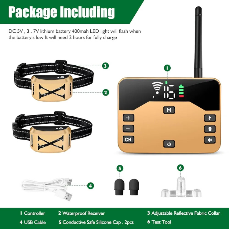 حالت حصار برقی بی سیم: در حالت حصار الکتریکی، سیستم یک مرز بی سیم را به شکل شعاعی با 10 سطح فاصله، محدوده سیگنال از 20 تا 200 متر می باشد. هنگامی که سگ شما خارج از محدوده باشد، قلاده گیرنده صدای هشداری را منتشر می کند و سپس یک شوک الکترواستاتیک ولتاژ پایین 3.7 ولتی به سگ شما یادآوری می کند که برگردد. یک فرستنده را می توان به چند قلاده گیرنده متصل کرد. دستگاه پس از روشن شدن به طور خودکار متصل می شود. (دارای دو عدد گردنبند)