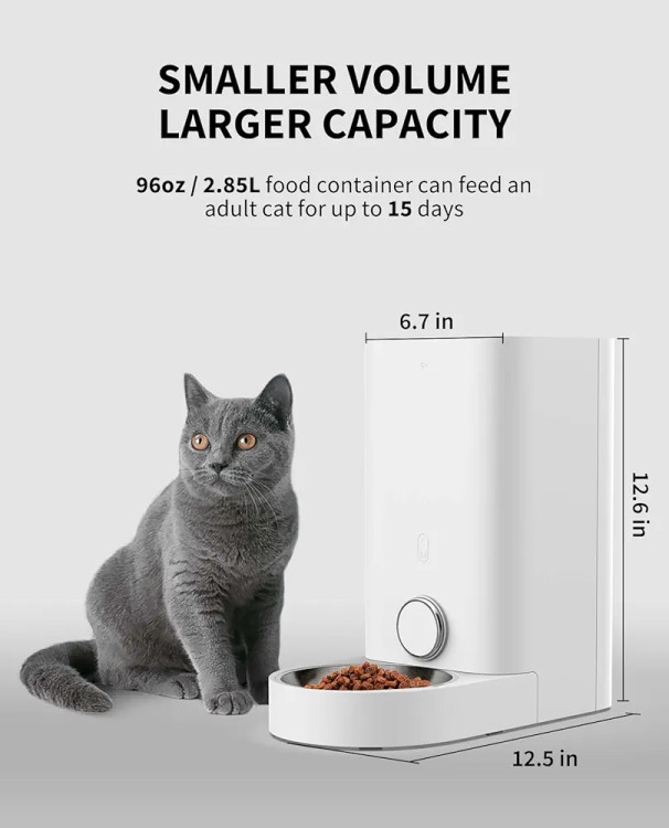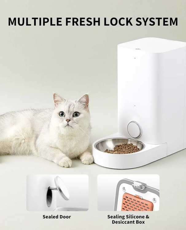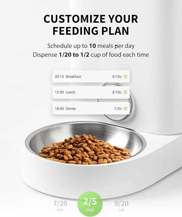 تغذیه شخصیسازیشده: با تغذیهکننده خودکار، میتوانید تغذیه را برنامهریزی کنید، برنامههای غذایی را تنظیم کنید و در هر زمانی به حیوانات خانگی خود غذا دهید. وعدههای غذایی را میتوان از ۵ گرم تا ۵۰ گرم توزیع کرد.