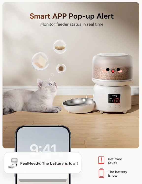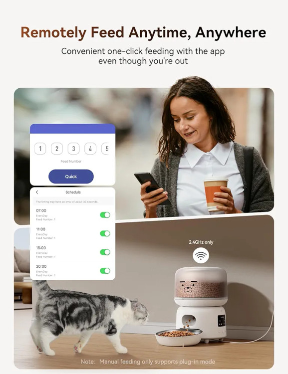 【کنترل از راه دور با اپلیکیشن】به سادگی به یک شبکه وایفای (2.4 گیگاهرتز) متصل شوید و میتوانید از طریق اپلیکیشن ما، برنامههای تغذیه سفارشی را از راه دور تنظیم یا تغییر دهید. همچنین میتوانید سوابق تغذیه را مشاهده کنید تا مطمئن شوید که فیدر طبق برنامه کار میکند. با فیدر هوشمند و خودکار حیوانات خانگی ما، هنگام گرفتگی غذا یا کم شدن باتری، به تلفن شما اطلاع داده میشود. با دردسر فشار دادن مکرر دکمهها خداحافظی کنید و از زندگی راحتتری برای خود و دوستان کوچک پشمالویتان لذت ببرید.