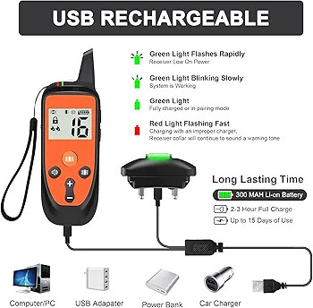 قابل شارژ و ضد آب: یقه پوست یک باتری لیتیومی قابل شارژ داخلی است، 1-2 ساعت شارژ کامل، می تواند به طور معمول برای 7-15 روز استفاده شود. فناوری ضد آب IP67 را می توان به مدت 30 دقیقه در عمق 1 متری آب غوطه ور کرد، سگ ها هیچ مشکلی برای استفاده از آن برای نوشیدن روزانه و هنگام بیرون رفتن در باران ندارند.