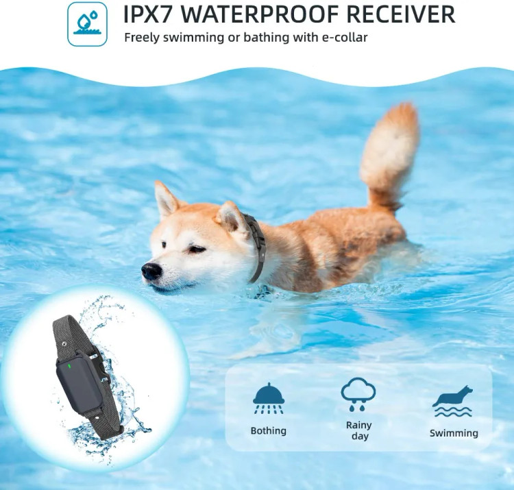 گیرنده ضد آب با 2 کانال از راه دور: گیرنده ضد آب IPX7 به دوست پشمالوی شما اجازه می دهد تا در زیر باران، آب یا چمن لغزنده یقه الکترونیکی را بپوشد. قلاده الکترونیکی می تواند تا 2 سگ را با کنترل از راه دور یکسان از طریق گیرنده های مختلف پشتیبانی کند.