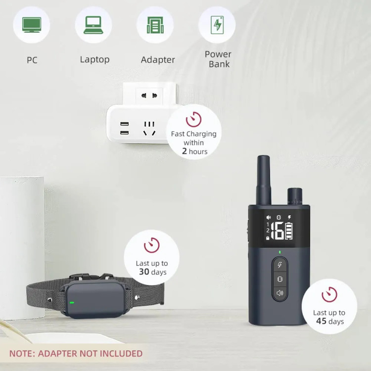 باتری طولانی مدت با شارژ سریع: قلاده سگ تا 35 روز زمان آماده به کار دارد و کنترل از راه دور تا 45 روز در صورت شارژ کامل در عرض 2 ساعت از طریق آداپتور تلفن همراه یا پریز USB در رایانه / پاوربانک / ماشین.