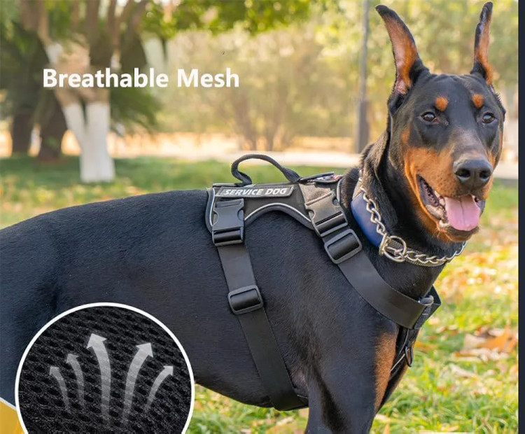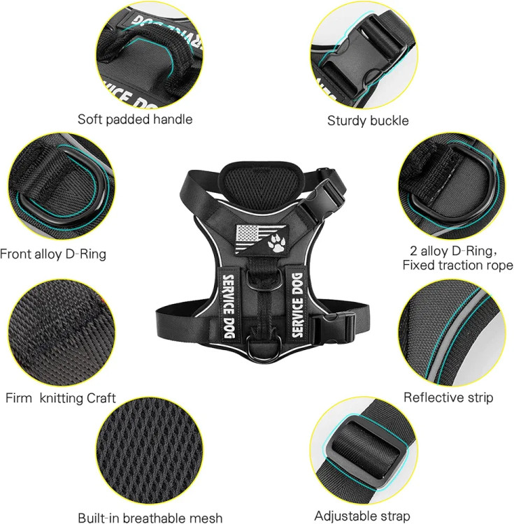 جنس: جلیقه سگ سرویس از نایلون مقاوم، نرم و راحت ساخته شده است. آستر مشبک با بالشتک نرم این مهار سگ باعث راحتی و محافظت می شود. همچنین می تواند سگ را خنک نگه دارد و از گرم شدن بیش از حد جلوگیری کند.