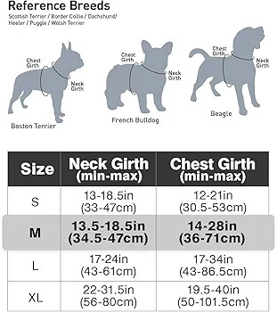 نژادهای توصیه شده: سگ های سایز متوسط - دور سینه: 14 "-28" / دور گردن: 13.5 اینچ - 18.5"، مانند فرنچ بولداگ، بیگل، بوستون تریر، اسکاتلندی تریر، بوردر کولی، داچشوند، هیلر