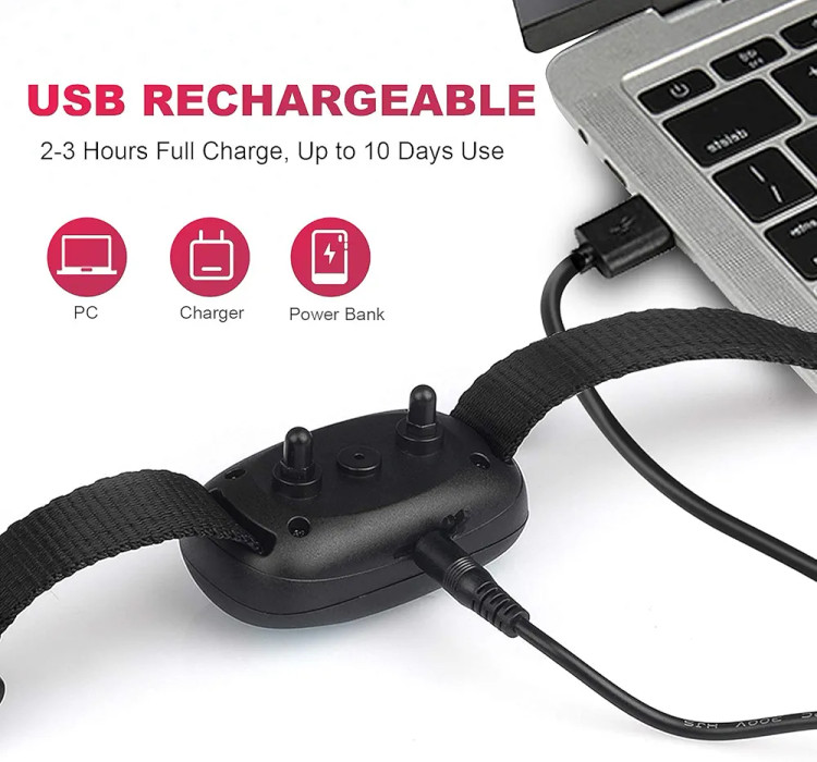 باتری قابل شارژ داخلی: قلاده سگ بدون شوک بدون پارس تقریباً 14 روز با عمر 1 باتری کار می کند. شارژ کامل در 2-3 ساعت کابل USB همراه با انواع مختلف شارژ مانند کامپیوتر، پاوربانک و غیره قابل سازگاری است.