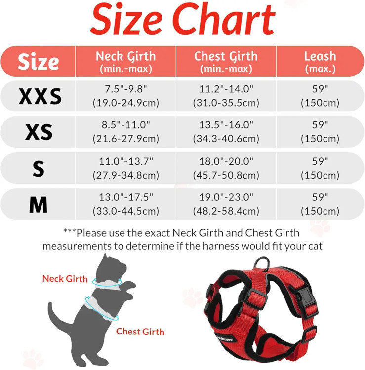 اندازه قابل تنظیم: دور گردن: 21.5-28 سانتی متر; دور سینه: 34.5-40.5 سانتی متر با طول بند 150 سانتی متر. توجه: از آنجایی که بدن گربه بسیار نرم است، برای اطمینان از صحت اندازه گیری هنگام اندازه گیری اندازه آن، باید نوار را محکم کنید تا از مشکل فرار گربه ها به دلیل بزرگ بودن اندازه مهار جلوگیری شود. لطفاً برای خرید یک مهار گربه عالی به نمودار اندازه ما مراجعه کنید