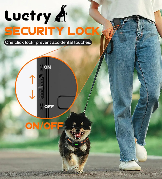 【طراحی قفل ایمنی】 کنترل از راه دور یقه ضد پارس مجهز به قفل ایمنی است که با یک کلیک قفل می شود تا از لمس تصادفی جلوگیری شود. این بدان معناست که می توانید با خیال راحت ریموت را در جیب یا کیف خود حمل کنید بدون اینکه نگران لمس و کارکردن تصادفی آن باشید. مناسب برای حمل کنترل از راه دور زمانی که نیاز به تمرین در فضای باز دارید، مانند هنگام دویدن.