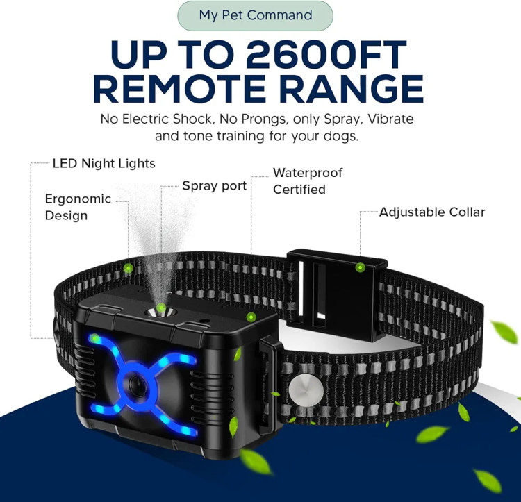 بدون باتری مورد نیاز است. یقه اسپری درجه بندی شده ضد آب و کنترل از راه دور کاملاً قابل شارژ IPX5 با عمر باتری طولانی تا 1 هفته قبل از شارژ مجدد. یقه ها می توانند در شرایط آب و هوایی در هوای آزاد تا باران ملایم/متوسط مقاومت کنند (یقه ها را نمی توان برای شنا استفاده کرد). مناسب برای تمام سگ ها و نژادها با بند قابل تنظیم برای اندازه های گردن 5.9 "-25.5" (15-65 سانتی متر)